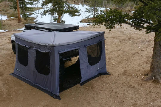 The 270 Awning room is the perfect addition to your FSR 270 Awning. Awning room has five large widows, main door and flooring included. The Awning room also has two vehicle access windows in the back. Or detach/Unzip the back of the Awning room wall to allow full access to your vehicle. The awning room attaches to the awning by velcro around the entire perimeter of the vehicle as well as the floor.